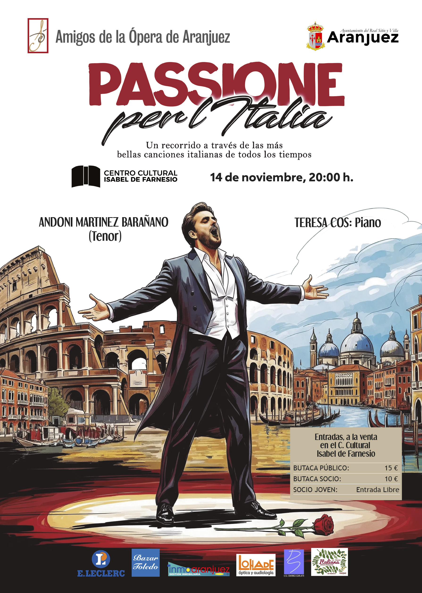 14nov20:0021:30AMIGOS DE LA OPERA. PASSIONE PER ITALIA. TENORVIERNES 14 DE NOVIEMBRE 20H. AUDITORIO. CC ISABEL DE FARNESIO. ENTRADA 15 EUROS NO SOCIOS. 10 EUROS SOCIOS. JOVEN ENTRADA LIBRE
