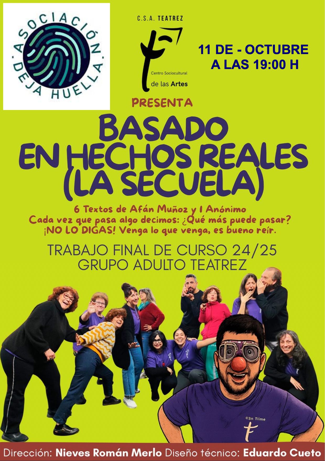 Función llevada a cabo por el Centro Sociocultural de las Artes, C.S.A. Teatrez, cuya recaudación irá a beneficio de la Asociación Deja Huella. Seis textos de Afán Muñoz y uno anónimo correspondiente al trabajo final de curso 24/25 del Grupo Adulto Teatrez, dirigido por Nieves Román Merlo y el diseñador técnico Eduardo Cueto.