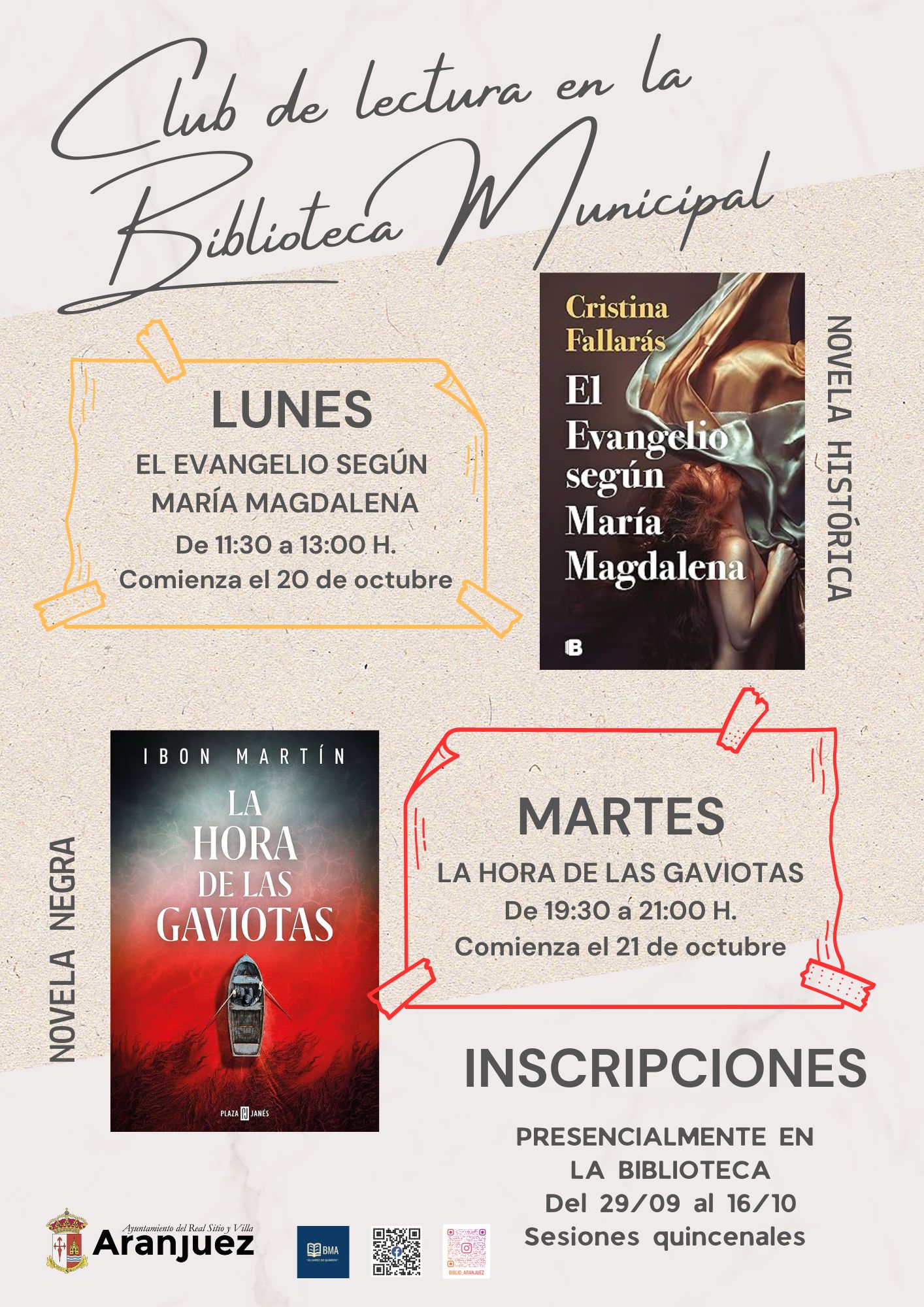 20oct(oct 20)11:3021(oct 21)19:30CLUB DE LECTURA EN LA BIBLIOTECA MUNICIPALLUNES 20 DE OCTUBRE 11.30H. EL EVANGELIO SEGUN MARIA MAGDALENA DE CRISTINA FALLARÁS Y MARTES 21 DE OCTUBRE 19.30H. LA HORA DE LAS GAVIOTAS DE IBON MARTIN