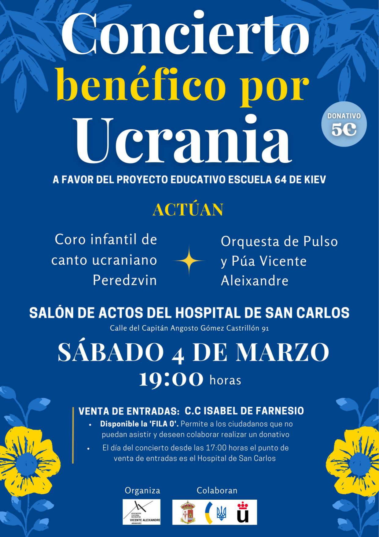 Concierto benéfico por Ucrania a favor del proyecto educativo Escuela 64 de Kiev. Salón de Actos del Hospital de San Carlos - C/ Capitán 91 Venta de entrada: C.C. Isabel de Farnesio El día