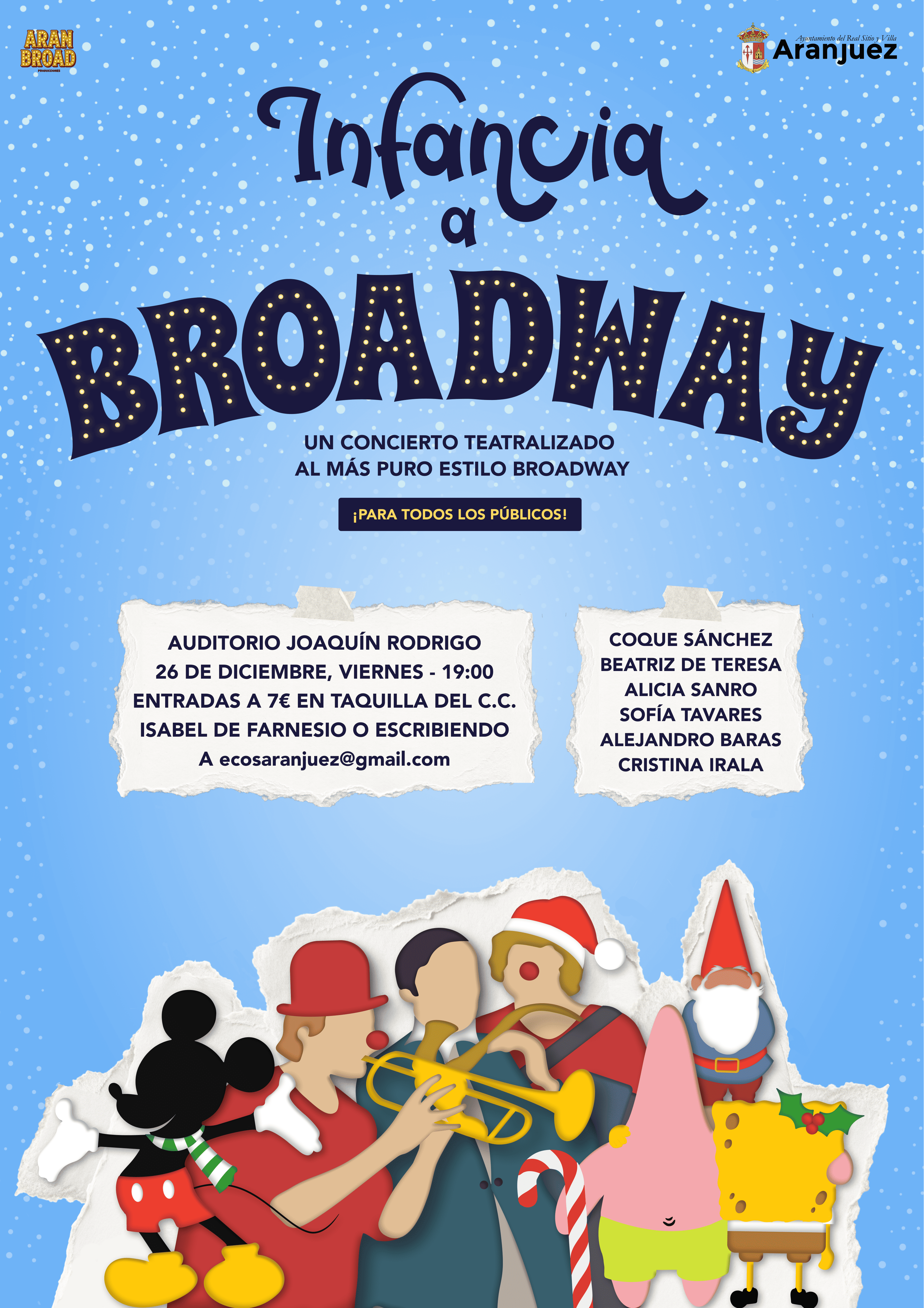 26dic19:0021:30CONCIERTO TEATRALIZADO "INFANCIA A BROADWAY"VIERNES 26 DE DICIEMBRE 19H. AUDITORIO CC ISABEL DE FARNESIO. ENTRADAS 7 EUROS EN CONSERJERÍA