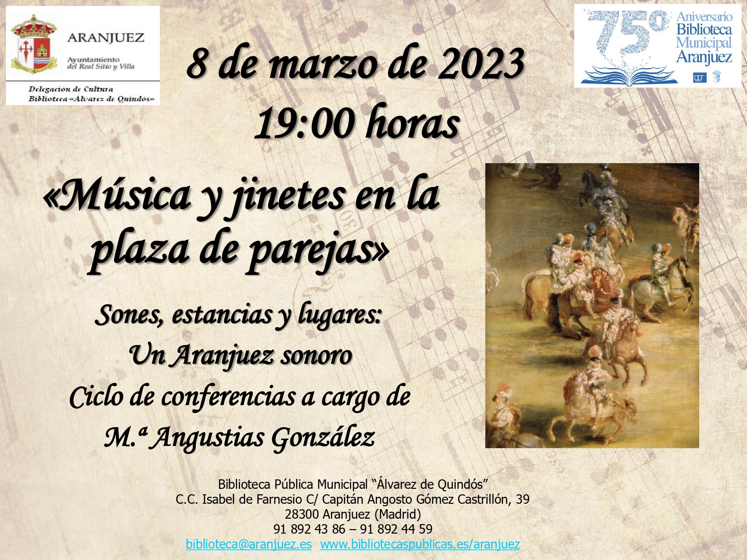 08mar19:00Conferencia: «Música y jinetes en la plaza de parejas» Sones, estancias y lugares: Un Aranjuez sonoroMiércoles 8 de marzo; 19:00 h, Sección Adultos de la Biblioteca. A cargo M.ª Angustias González López. Entrada libre