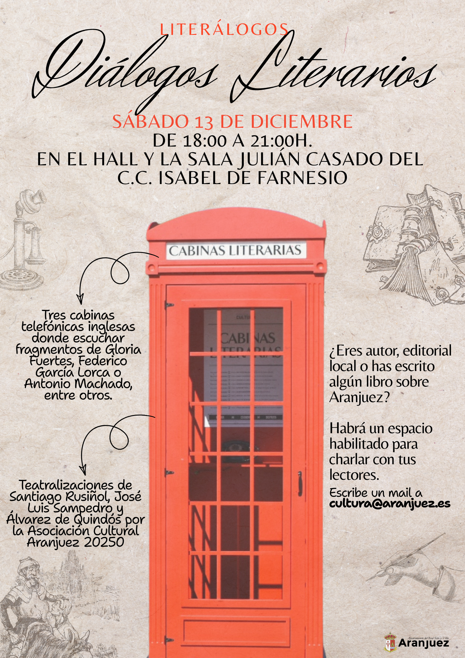 El Ayuntamiento de Aranjuez, a través de la Delegación de Cultura presenta ‘Literálogos. Diálogos Literarios’, una jornada dedicada a celebrar la literatura, la creación local y el encuentro entre lectores, puntos de venta y autores de la ciudad. La actividad se desarrollará el próximo sábado 13 de diciembre, de 18:00 a 21:00 horas, en el Centro Cultural Isabel de Farnesio.