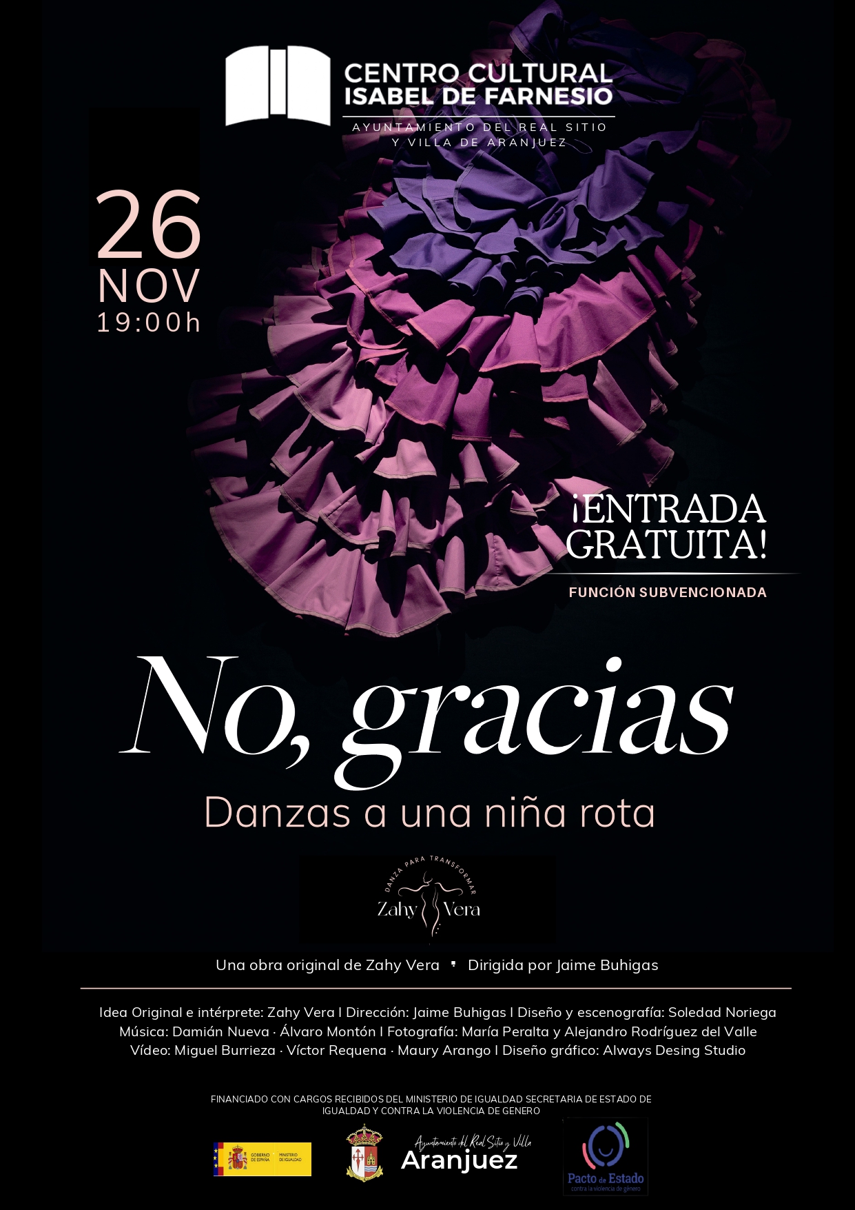 26nov19:0021:00ESPECTÁCULO DE DANZA. NO, GRACIAS. DANZAS A UNA NIÑA ROTAMIERCOLES 26 DE NOVIEMBRE 19H. AUDITORIO CC ISABEL DE FARNESIO. ENTRADA GRATUITA