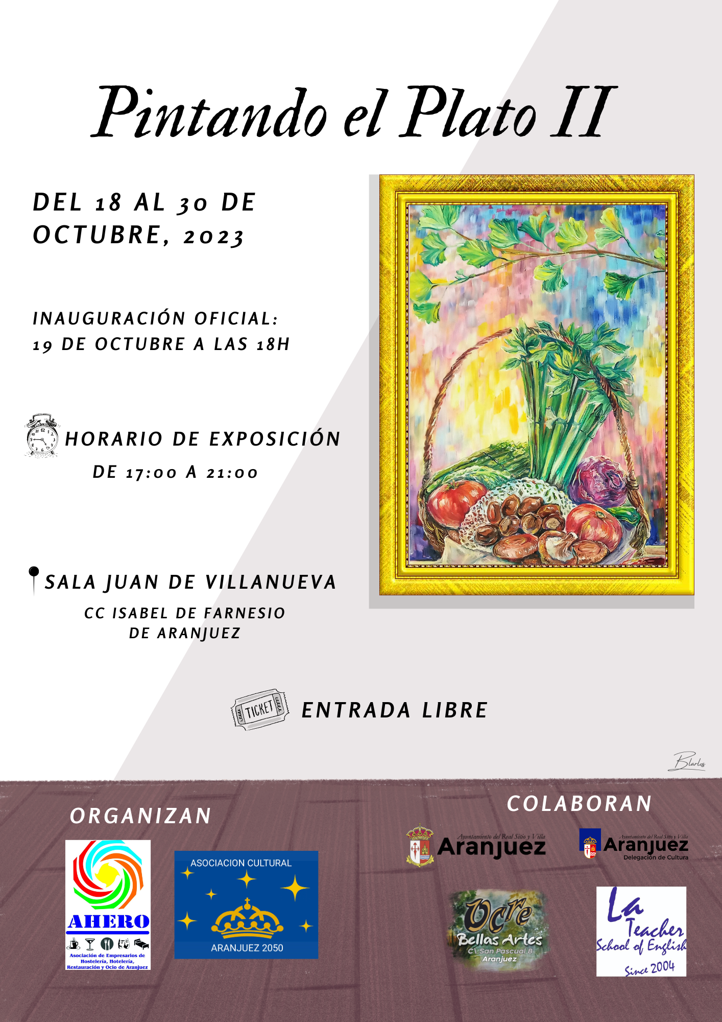 EXPOSICIÓN PICTÓRICA DEL II ENCUENTRO DE GASTRONOMÍA, FOTOGRAFÍA Y PINTURA PAISAJE CULTURAL DE ARANJUEZ CELEBRADO EN DICIEMBRE DE 2022. "PINTANDO EL PLATO II" DEL 18 AL 30 DE OCTUBRE DEL 2023 INAUGURACIÓN OFICIAL: JUEVES