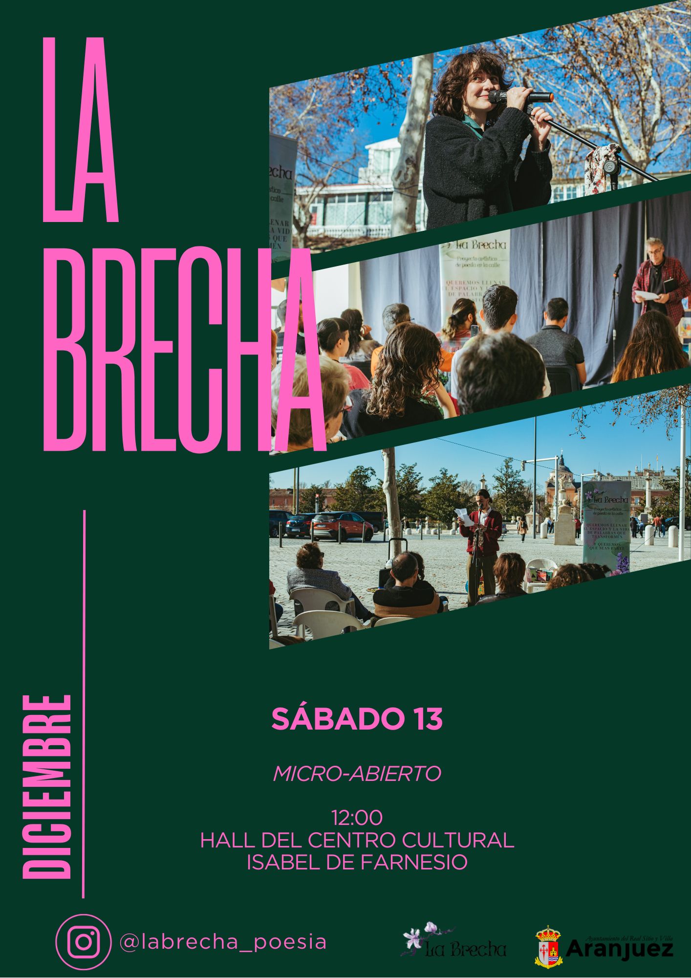 13dic12:0014:00LA BRECHA @POESÍA. MICRO-ABIERTOSABADO 13 DE DICIEMBRE 12H. MICRO ABIERTO. HALL CC ISABEL DE FARNESIO